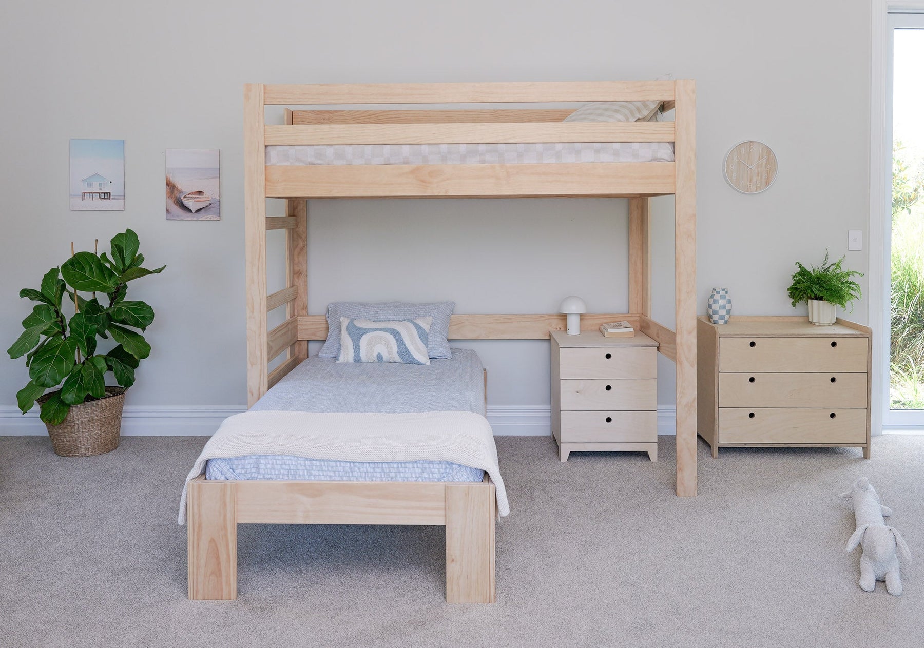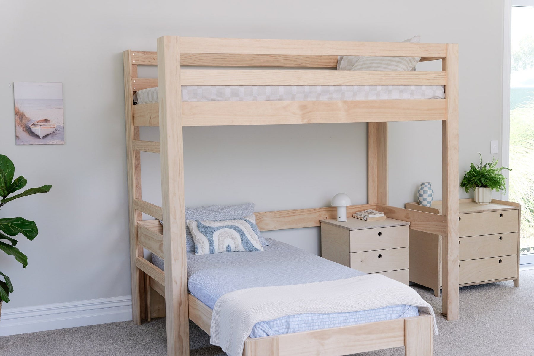 A timeless L-shaped bunk bed in solid NZ pine, designed to maximise space while keeping a clean, versatile look. The L-shape layout creates a more open and practical room setup, perfect for shared bedrooms or sleepovers. A durable and functional L-shaped bunk bed for kids in New Zealand and Australia.