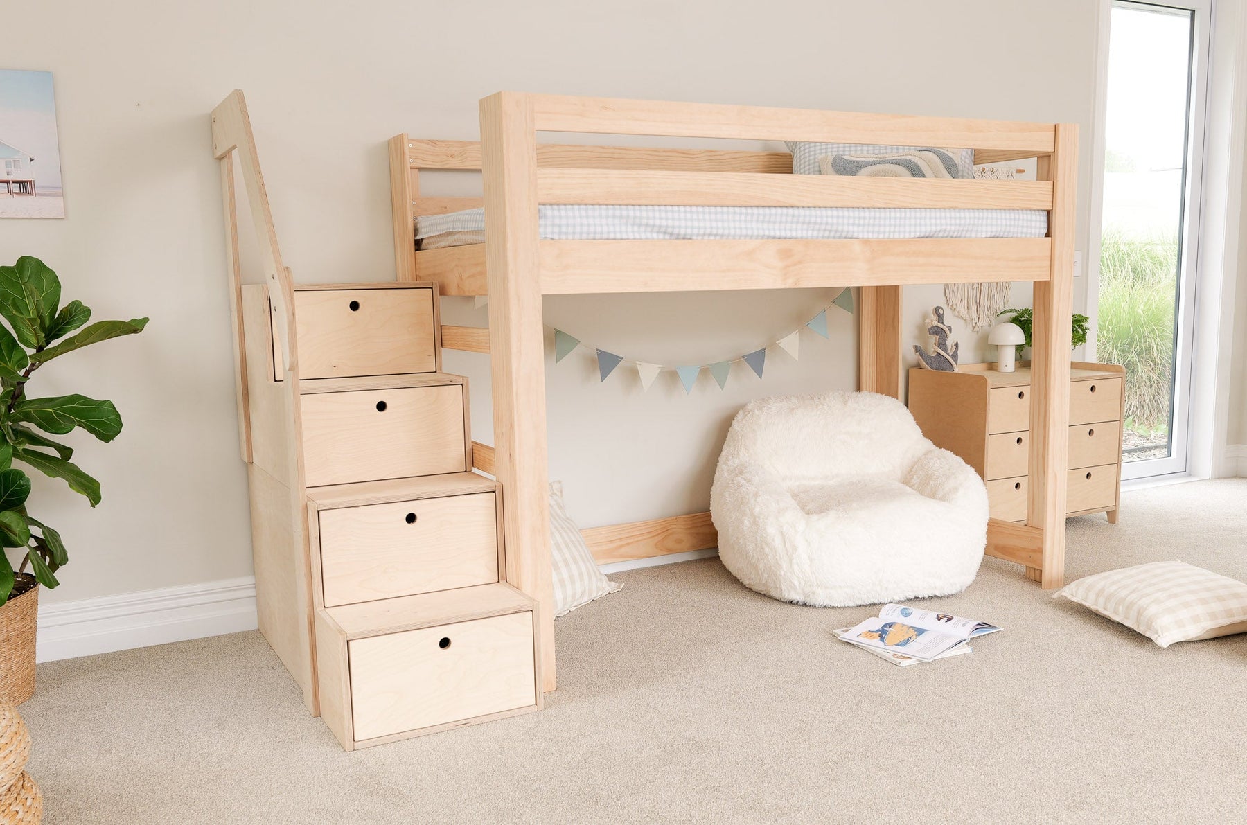 A timeless classic low loft bed made from solid pine, designed to suit any interior style. Its low height offers added safety for younger children, while the under-bed space is perfect for storage or play. A versatile kids' loft bed solution for New Zealand and Australia.