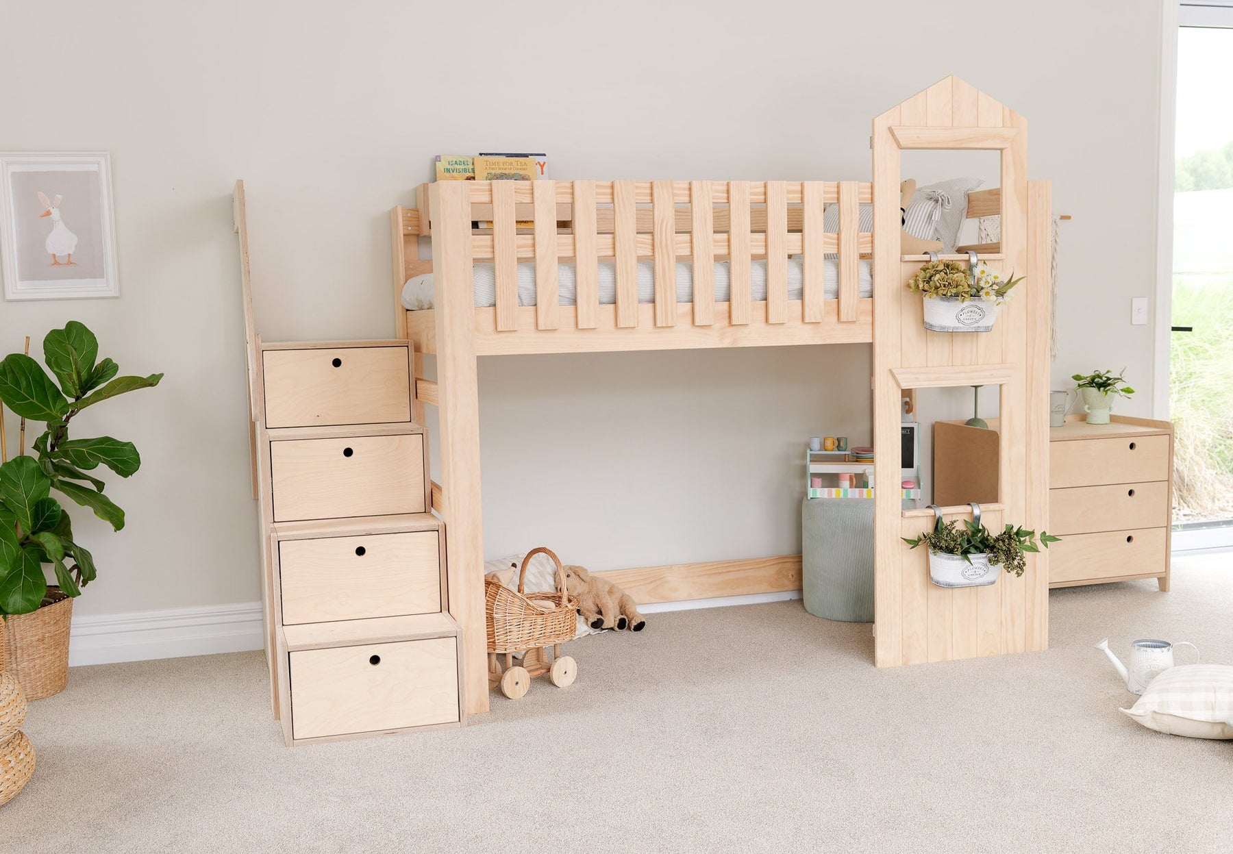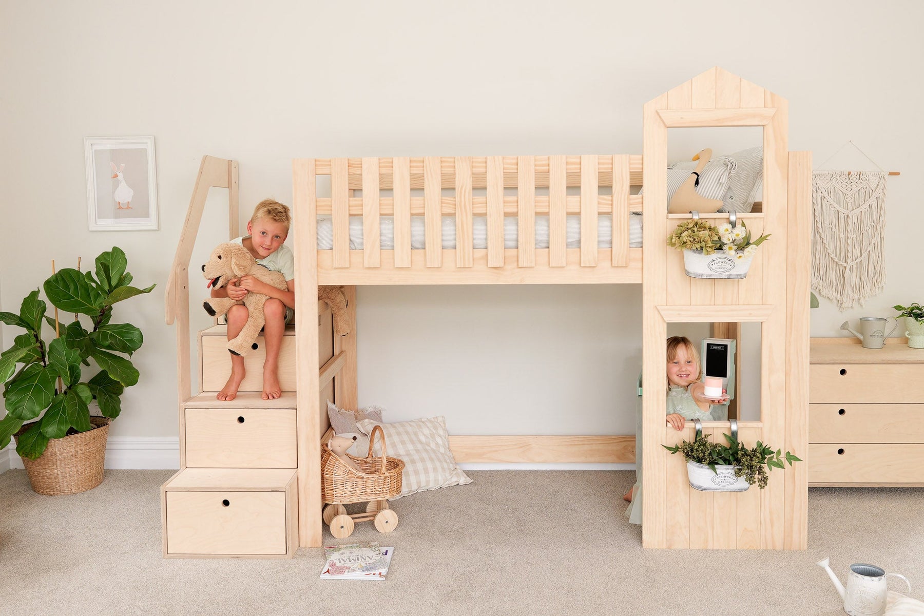 Inspired by countryside living, this country-style low loft bed in solid pine brings charm and warmth into any child’s room. With its low height and practical design, it’s ideal for younger kids and growing families across New Zealand and Australia.