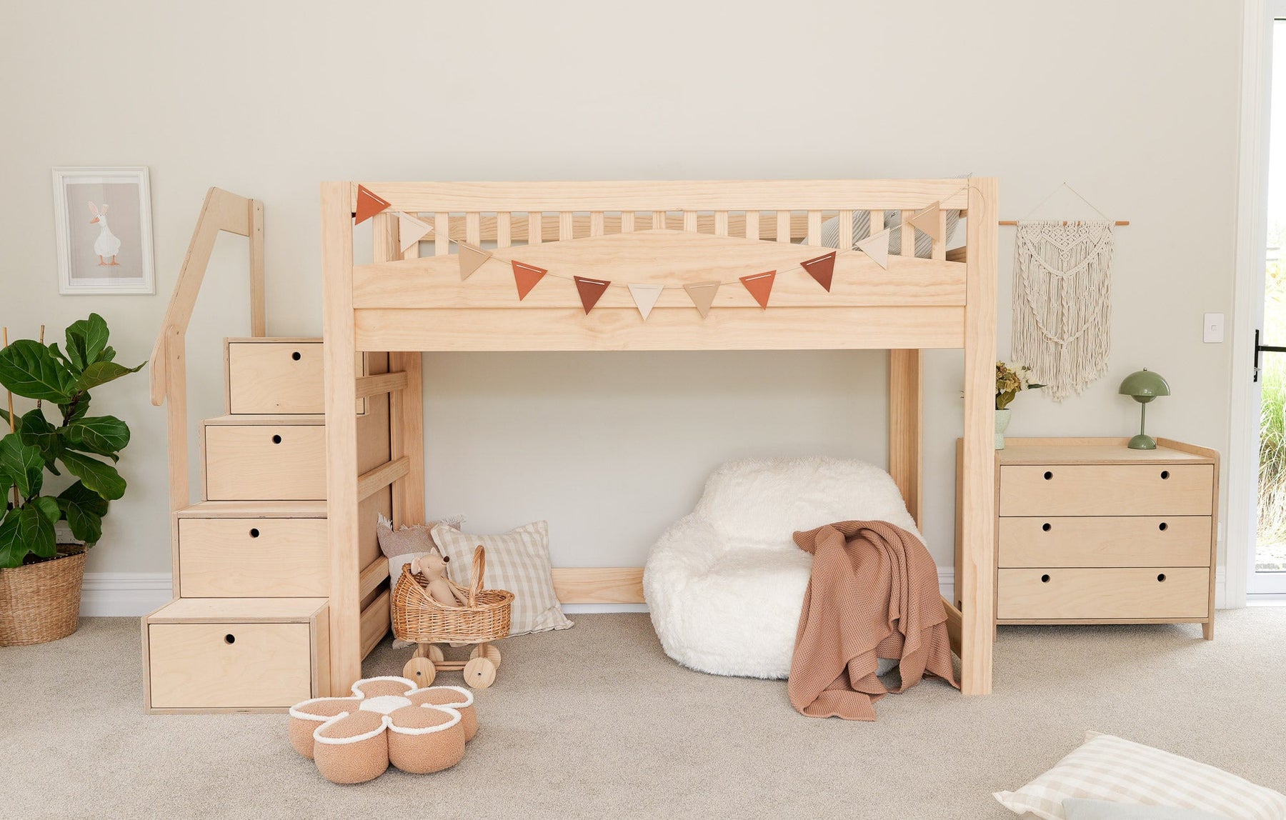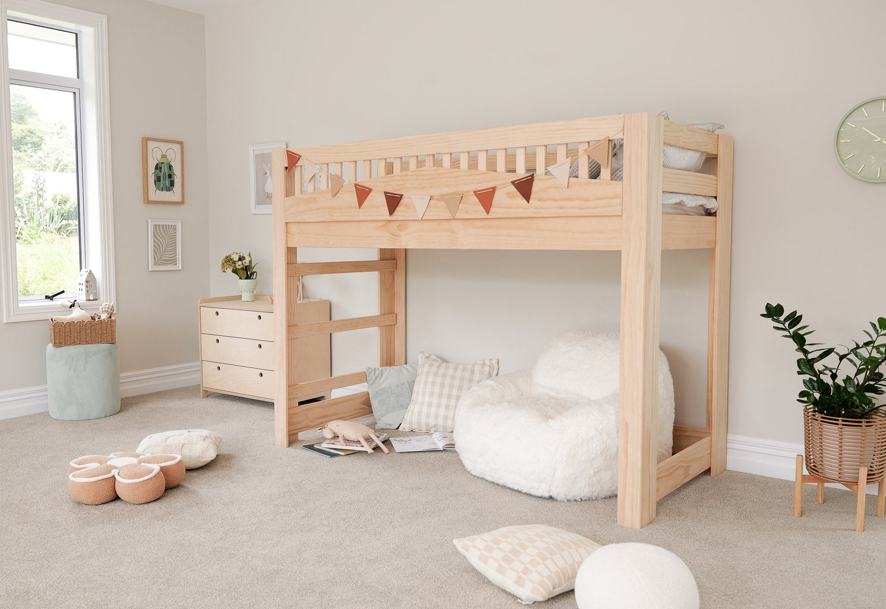 Create a warm and inviting space with our Cozy low loft bed in NZ pine. Designed for comfort and everyday living, it’s perfect for reading corners, soft furnishings, and relaxed play. A beautiful low loft bed for kids' bedrooms in NZ and Australia.