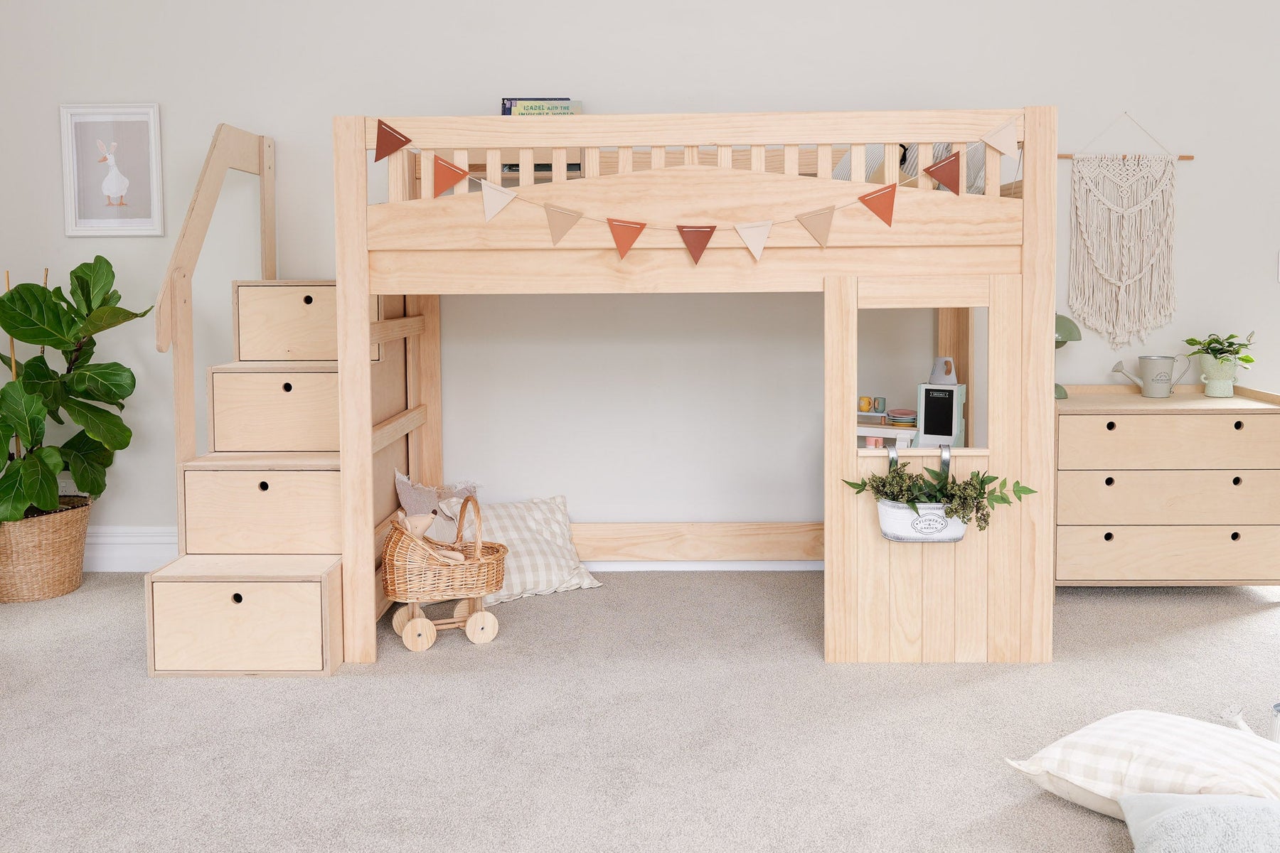 Turn bedtime into an adventure with our Tree House low loft bed in NZ pine. Designed to spark imagination while staying safe and accessible, this bed is perfect for younger children. A playful yet practical kids' loft bed for NZ and AU homes.